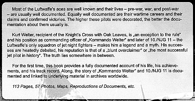 Een behoorlijke pil met zijn 596 blz. Goede kwaliteit papier waarop de foto's goed uitkomen. Ook in dit boek komen we Kurt Welter ("Phantom" der Nachtjagd) tegen, net zoals in de titel "The Jet Night Fighters".