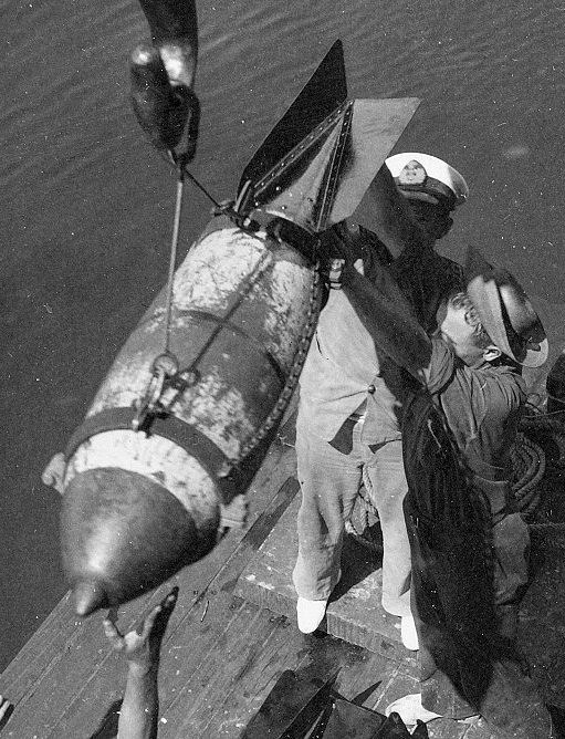 Ik heb foto's van bommen die naar een vliegboot vervoerd worden om daar te worden geladen.