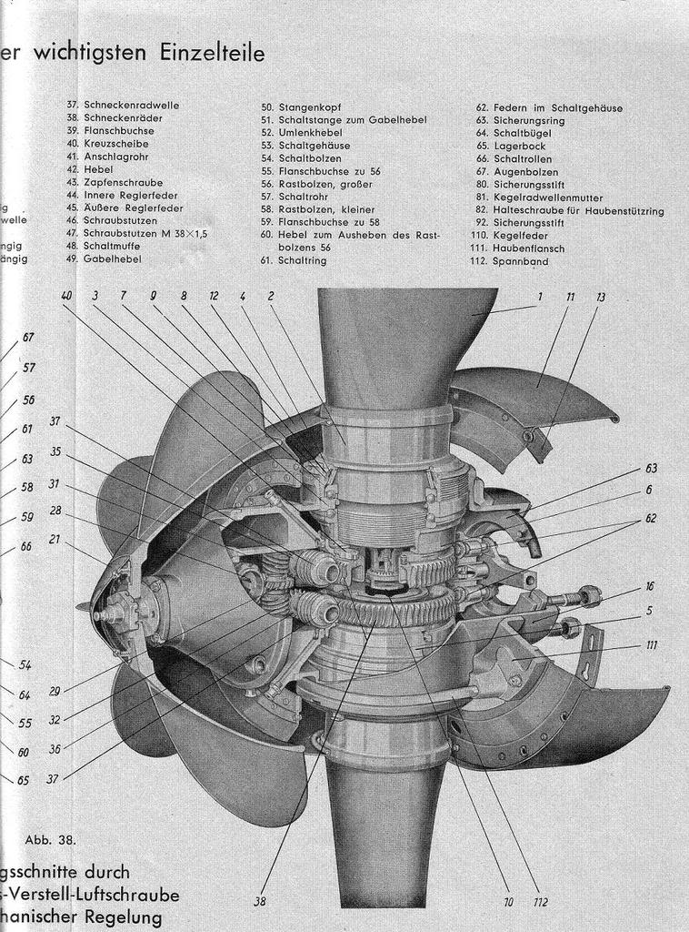 The twelve-cylinder Argus engines drove Argus two blade, controllable pitch propellers. The vaned propeller hub was the pitch control for the propeller.