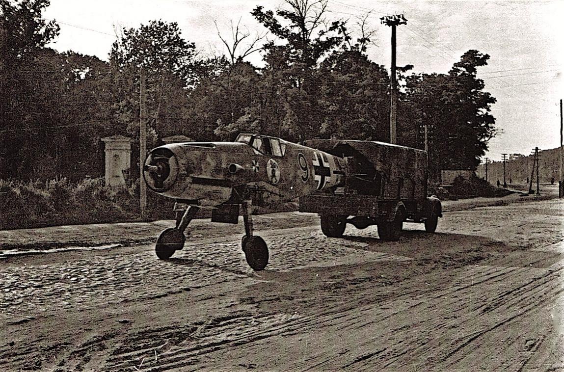Messerschmitt Bf/Me 109. Het linker embleem is van II./JG 3, het rechter is het persoonlijke embleem van Lt. Max-Bruno Fischer. De "schwarze 9" wordt na een landing buiten het vliegveld weer naar de "Einsatzplatz" van de II./JG 3 gesleept. In juli 1941 ging II./JG 3 over van de 109 F-2 naar de 109 F-4. Deze foto is van zomer 1941 maar geeft verder geen datum.