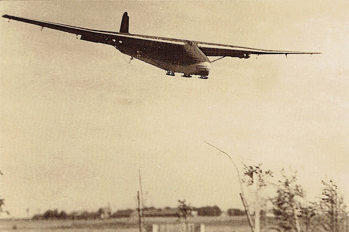 Messerschmitt Me 321 "Gigant" start met behulp van "Walter Starthilfsraketen". Aangezien er geen sleeplijn te zien is neem ik aan dat dit een proefneming is om die starthulp te testen want zo lang kan hij zonder gesleept te worden niet in de lucht blijven.