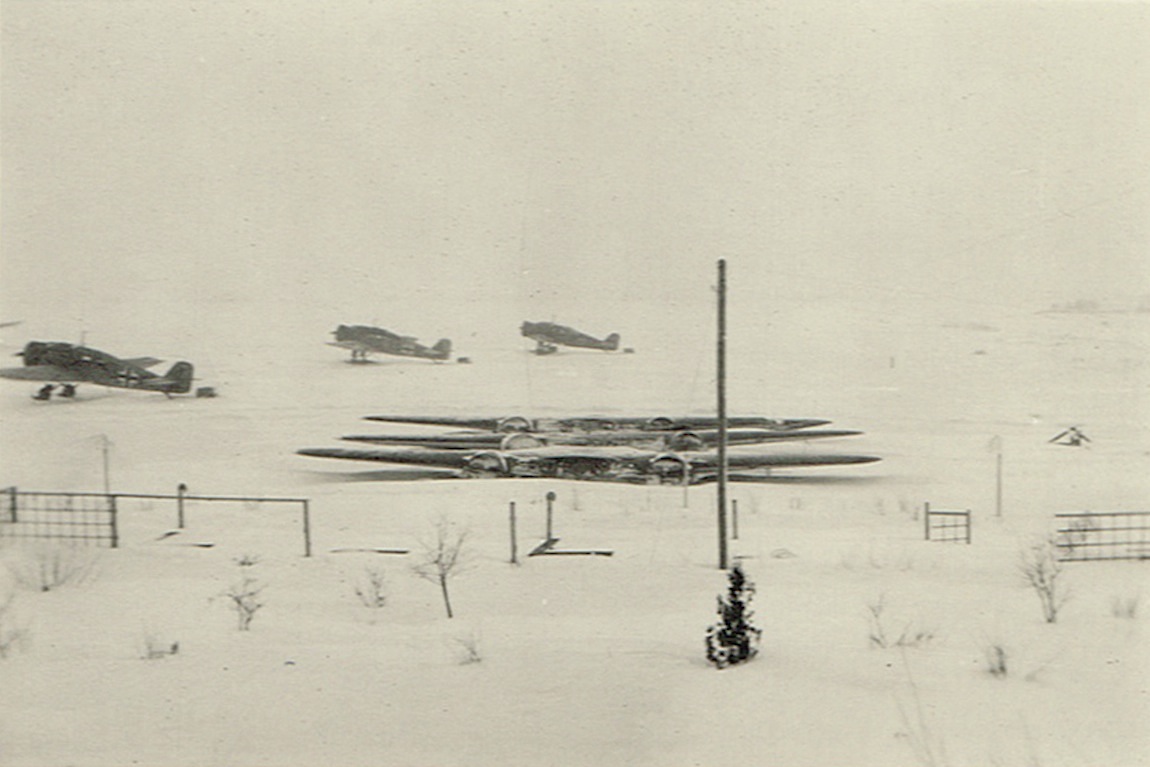Vliegbasis in de winter. Drie Junkers W.34 op ski's. Ook liggen er drie vleugels klaar voor transport.
