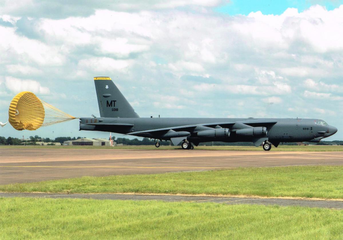 Boeing B-52 met geopende parachute.