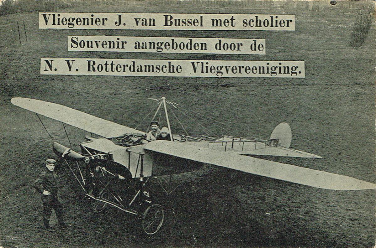Ik neem aan dat het toestel van J. van Bussel daar genoemd bij de vliegweek van 1911 hetzelfde is als hier afgebeeld op een kaart van de N.V. Rotterdamsche Vliegvereeniging.