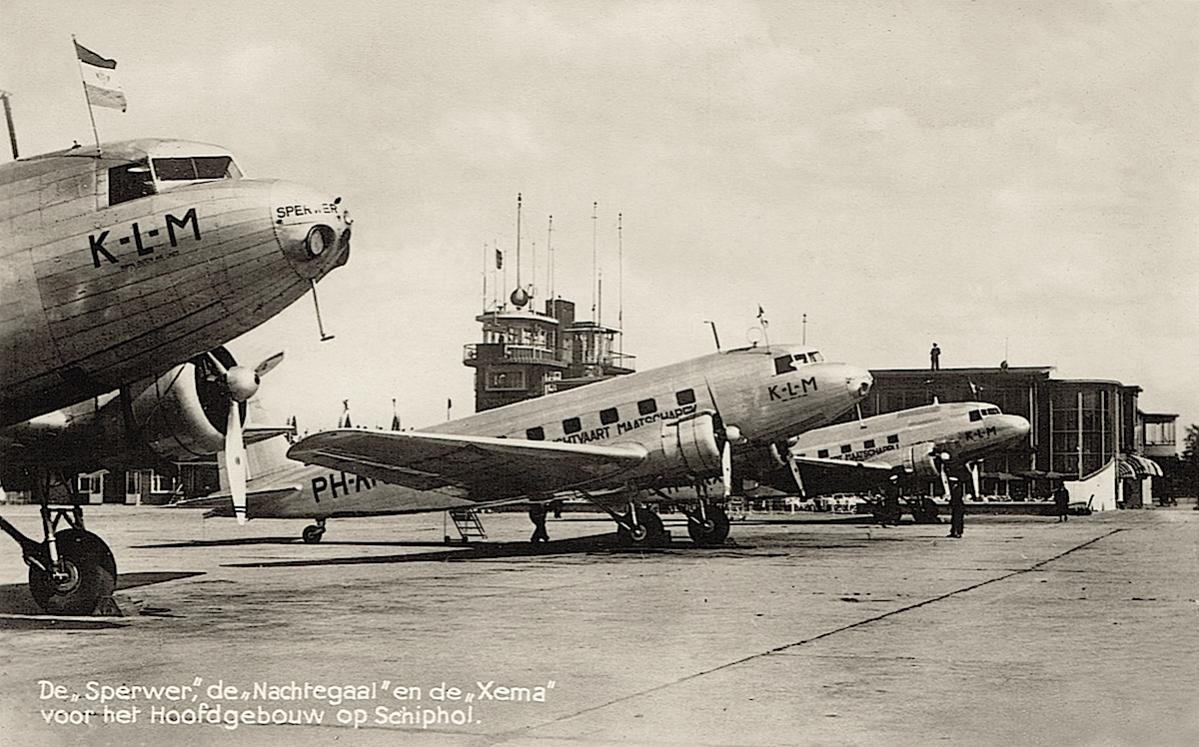 Douglas DC-2's PH-AKS 'Sperwer" en PH-AKN 'Nachtegaal' en Douglas DC-3 PH-ARX 'Xema' op Schiphol.