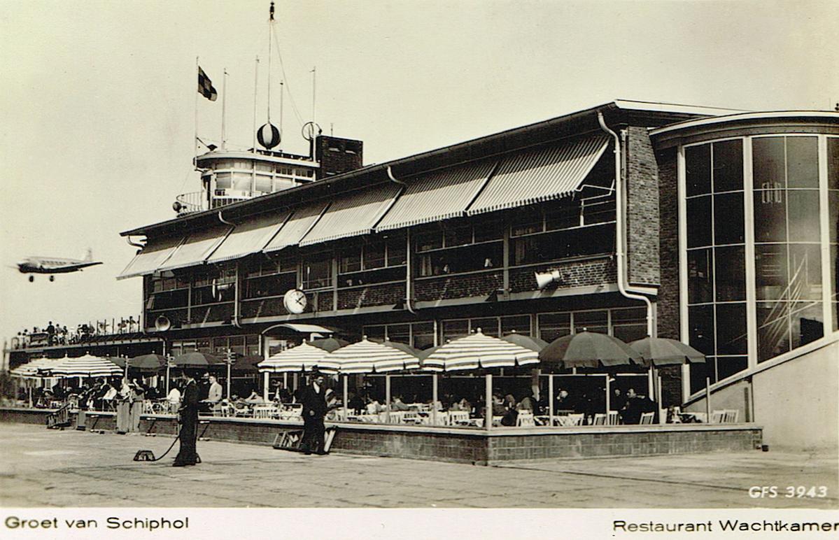 Schiphol. Restaurant wachtkamer en landende DC-2.