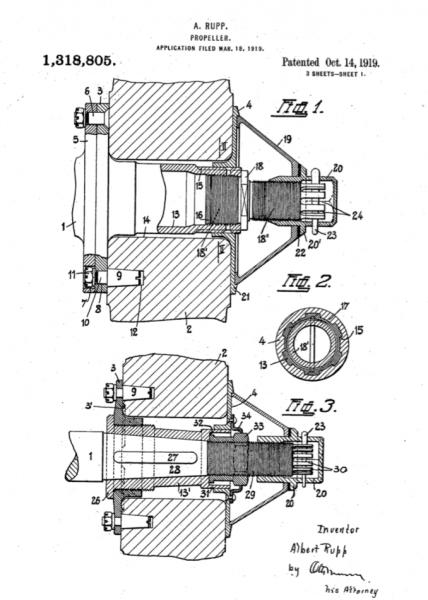 Ik ga ervan uit dat deze gemonteerd is geweest met het zgn. Rupp systeem. Daarbij zijn aan de achterzijde van de naaf vier positioneergaten aangebracht. Die lopen niet door naar voren. Met een centrale bout werd de propeller aan de motor vast gezet. Het patentblad laat zien hoe dat werkt. Lees ook: www.woodenpropeller.com/DVII.html