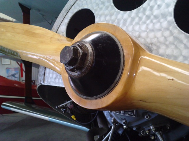 Tenslotte geeft deze prop een schamele indruk. Hij is deels gedelamineerd, er is een knullige reparatie aan de tip te zien, er ontbreekt en stuk hout aan de naaf en dan die brandplekken.