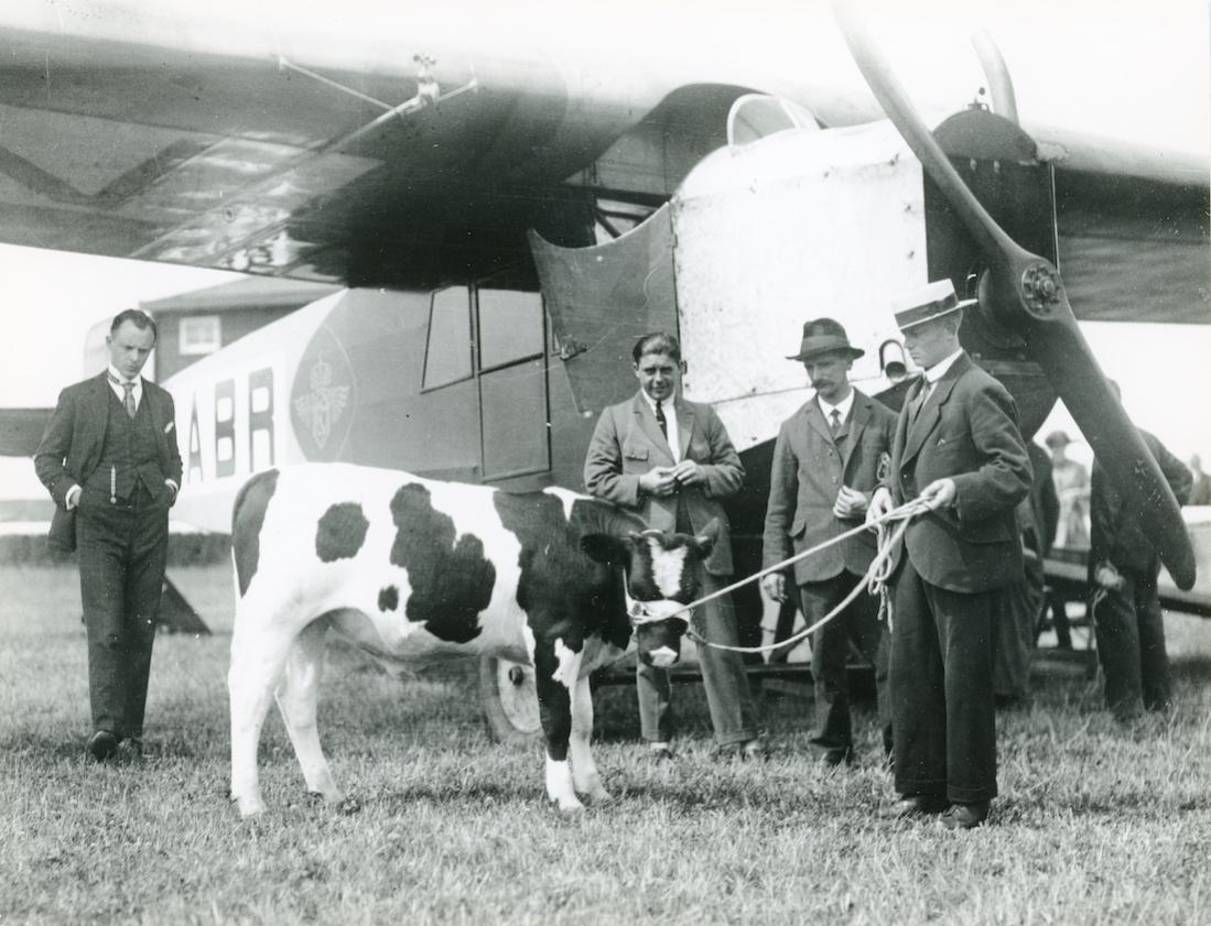 KLM Fokker F.III H-NABR op Waalhaven. Fokstier Nico II gaat op transport.