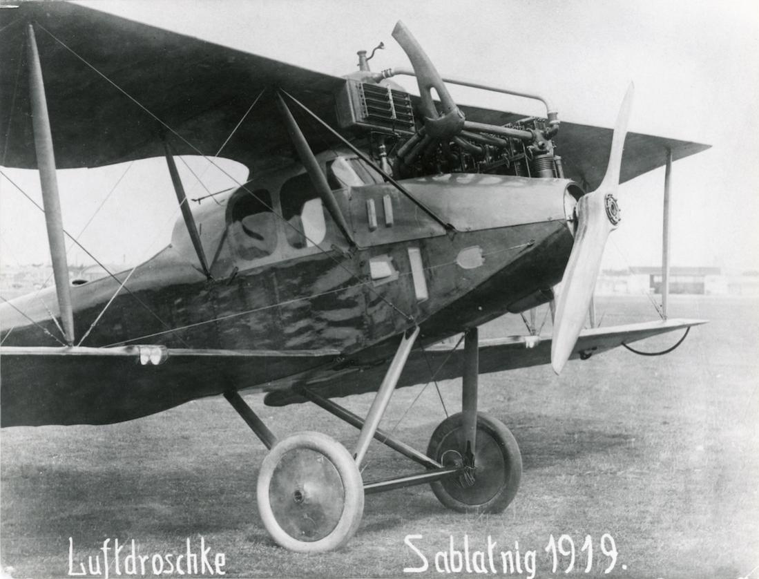 Sablatnig P.1 uit 1919. Op de foto "Luftdroschke" genoemd. Droschke staat voor huurrijtuig of taxi. Het was ontwikkeld uit de N.1 nachtbommenwerper en had een gesloten passagierscabine. Het toestel werd gebruikt door "Lloyd-Luftverkehr Sablatnig". Er is helaas geen registratie te zien.