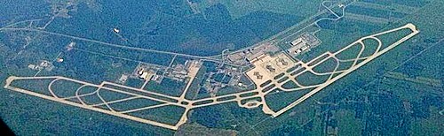 Een vliegveld met een vreemde vorm, van boven gezien.