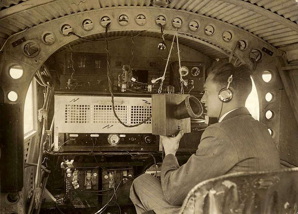 Lijkt op een Junkers vliegtuig en deze meneer zit in een soort van omroepvliegtuig. (Je weet wel, zo'n auto met speakers die door de straat rijdt om reclame te maken, maar dan d.m.v. een vliegtuig.)