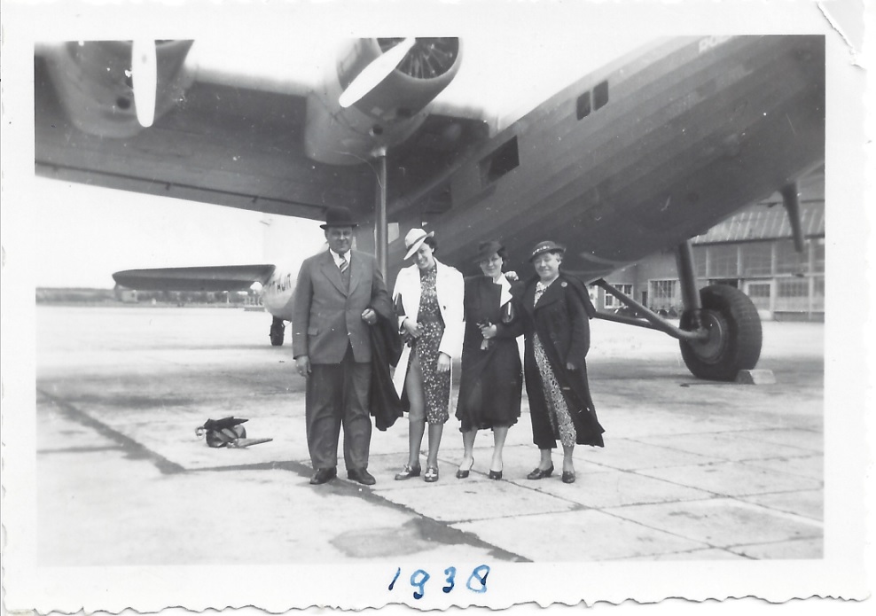 Achterop staat: Schiphol 10 Juli 1938. Moeiteloos herkennen we de Arend PH-AJA en ook moeiteloos herken ik mijn grootouders die angstvallig hun 2 dochters bewaken met links mijn moeder. Wat een split heeft ze hè.