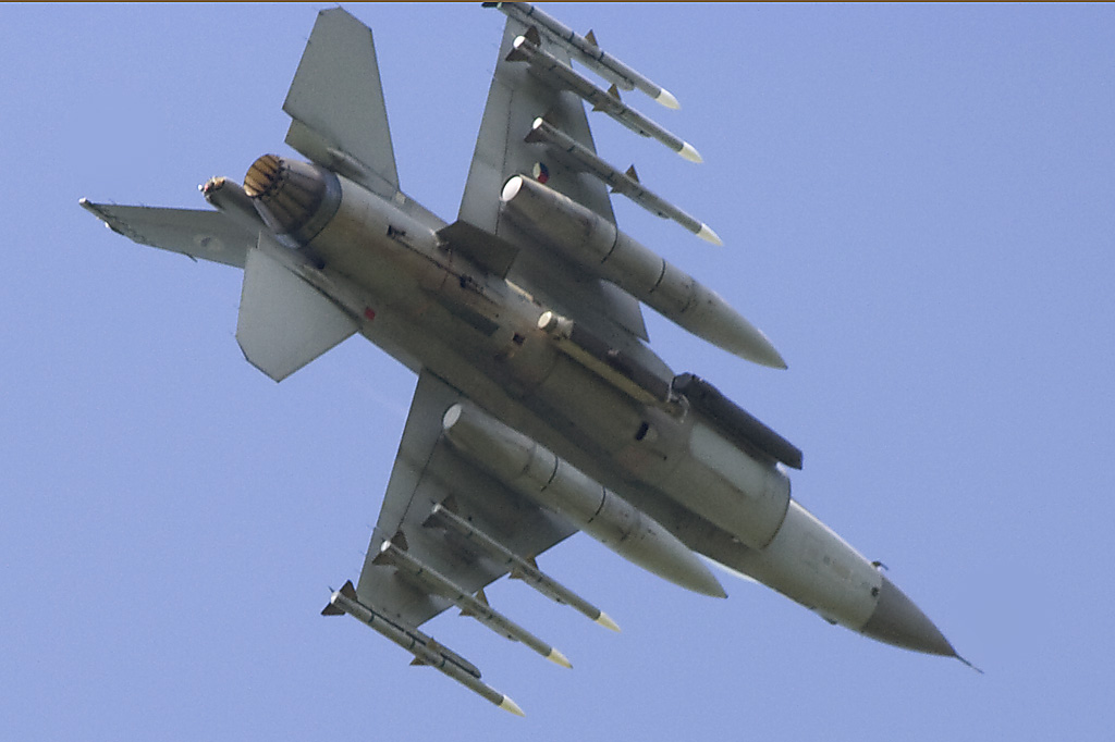 F-16AM J-020 in de break voor een landing op de 05 van Leeuwarden. Twee grote kerosinetanks, 6 AMRAAMS(!), een ALQ-131 en een Litening pod... en dan te bedenken dat de YF-16 uit het LWF-programma kwam. (LWF = Light Weight Fighter)
