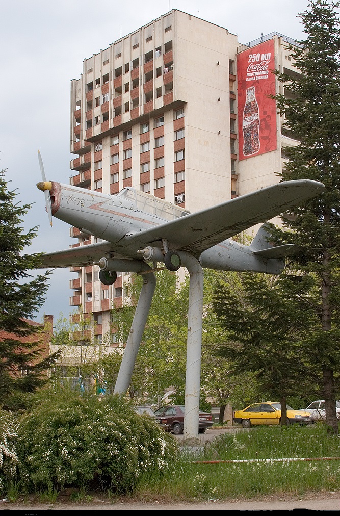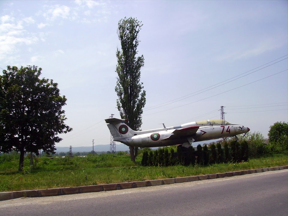 Een L-29 Delphin langs een toegangsweg naar Svilengrad.
