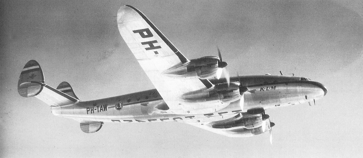 Een Connie die overvliegt, met onder de linker vleugel de registratie, maar onder de rechter de maatschappijnaam. KLM.