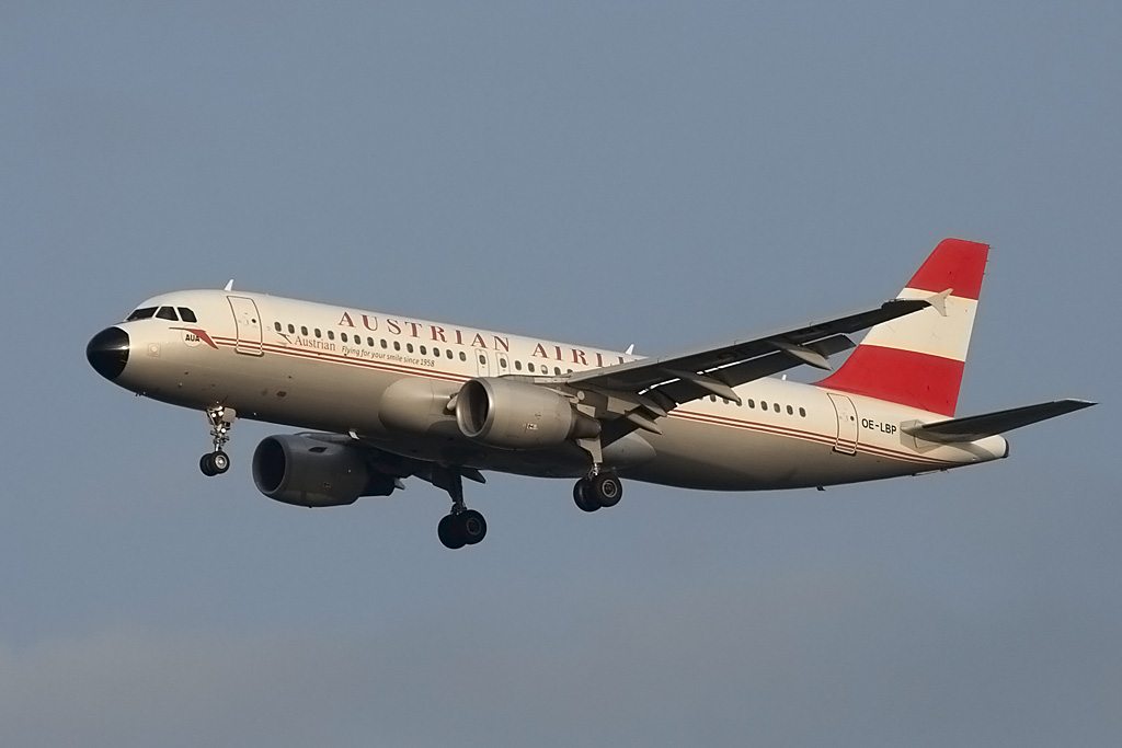 Deze keer is het A320-214 OE-LBP, die het ouwe Austrian Airlines kleurenschema laat zien: