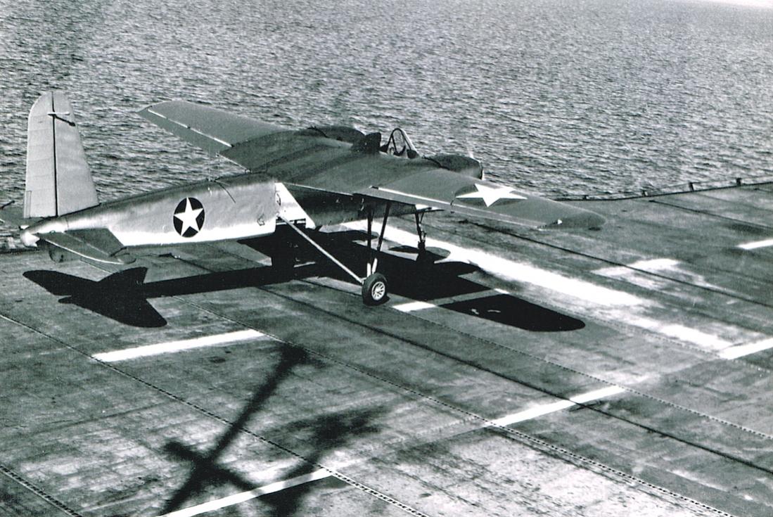 TDN-1 radio controlled World War II drone op vliegdek USS Sable (1943).
