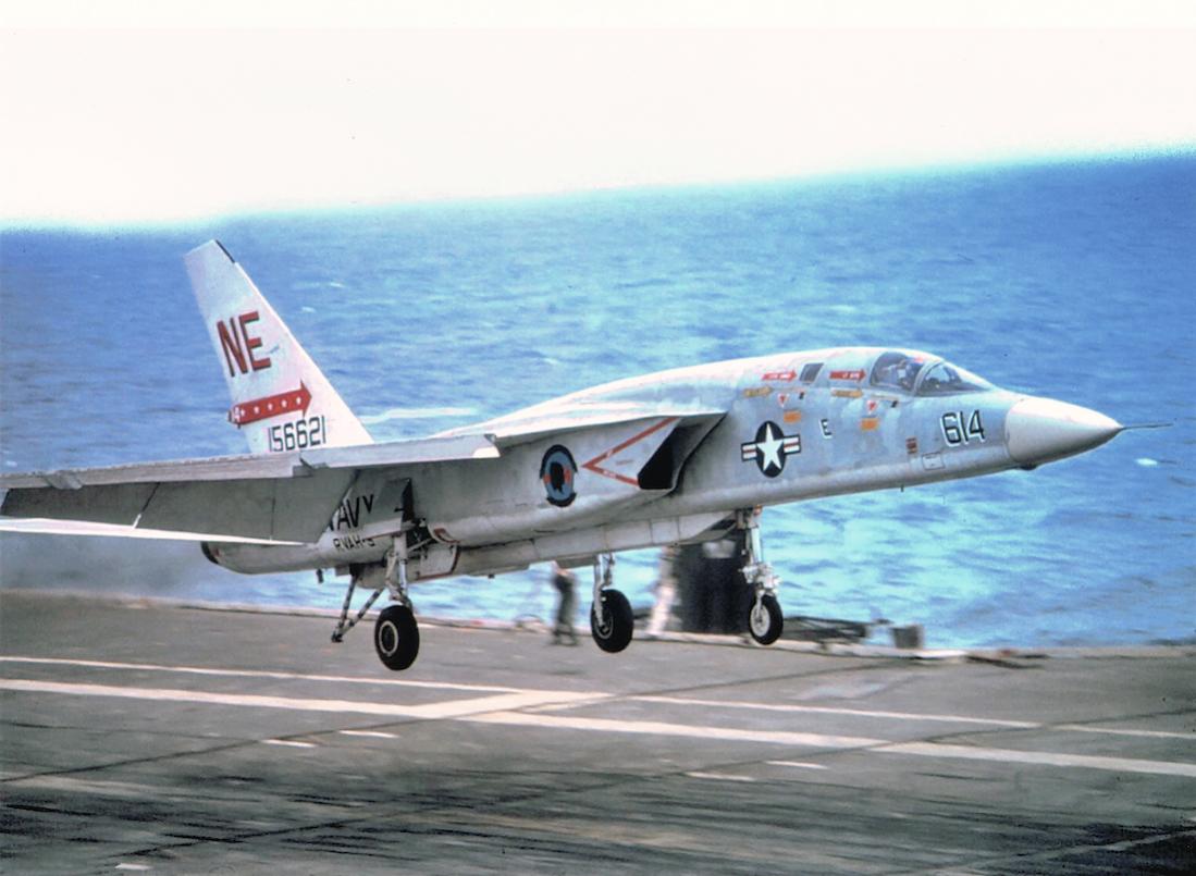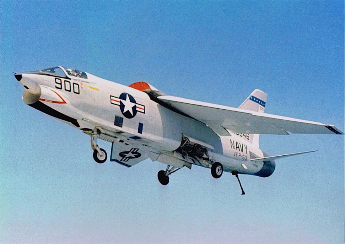 Vought RF-8A Crusader van VFP-63 'Eyes of the Fleet' tijdens landing op USS Midway (CV 41).