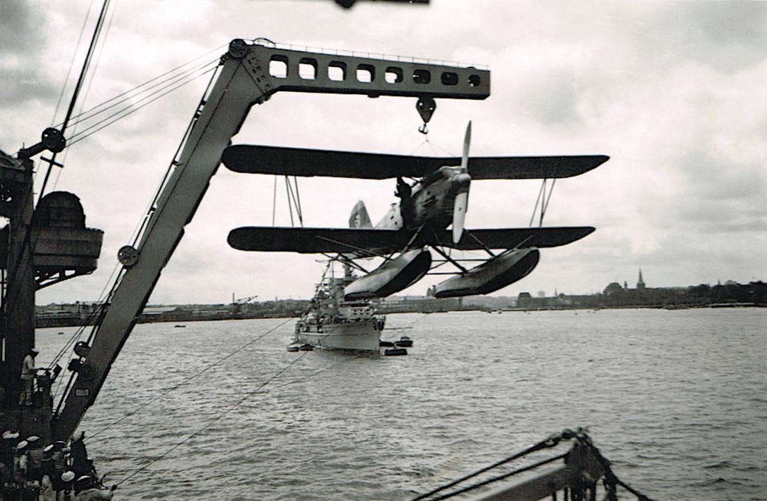 Kiel 2.VI.1936. De lichte kruiser "Köln" zet boordvliegtuig Heinkel He 60 overboord.