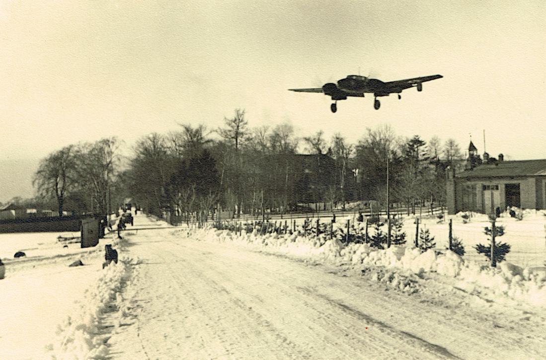 Landende Me-110 boven sneeuwlandschap.