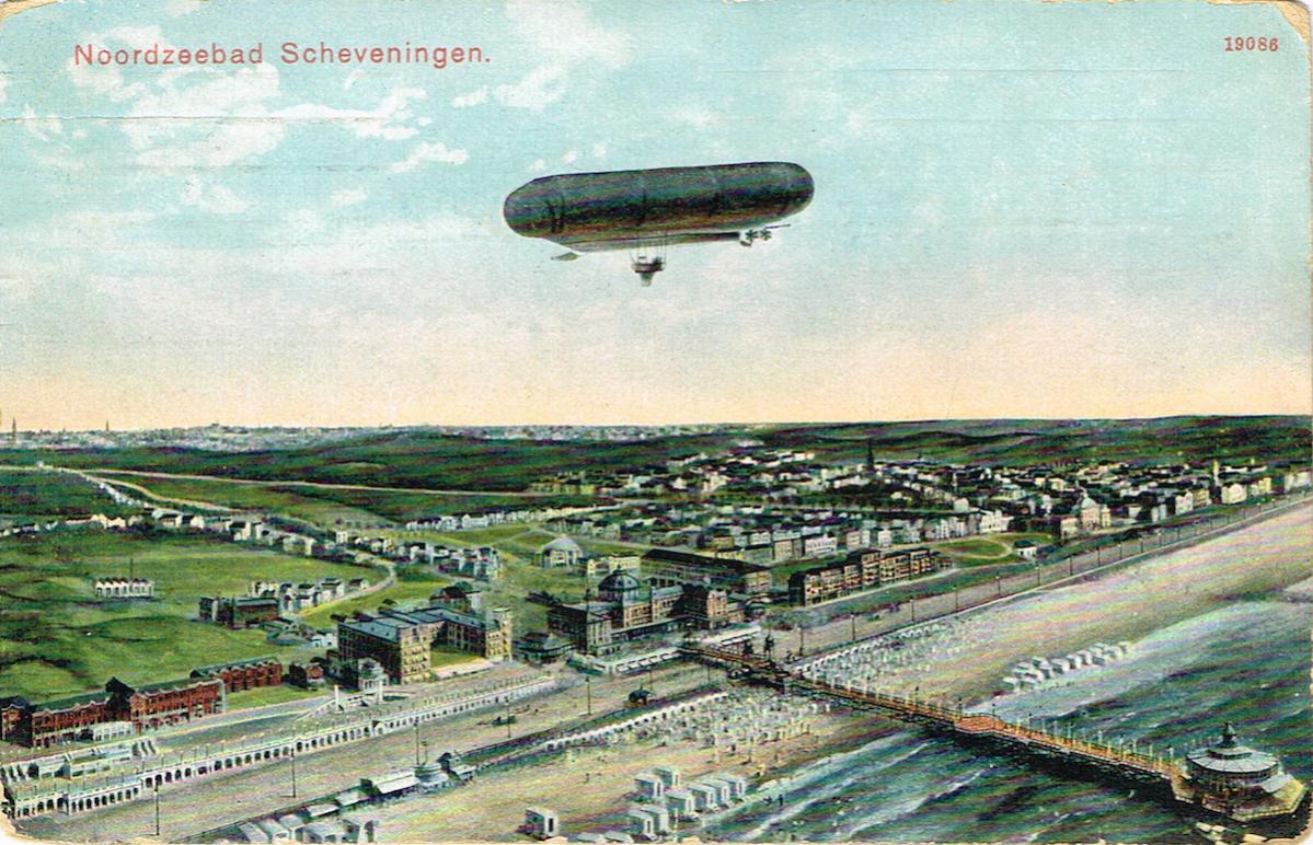 Leuk prent van Scheveningen. Niet zozeer vanwege de Zeppelin, maar om te zien hoe klein de plaats toen was.