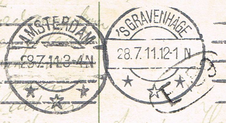 Een gelopen kaart van Den Haag (gestempeld 12-1 uur 's nachts) naar Amsterdam (gestempeld 3-4 uur 's nachts) op 28.7.1911. Stempels onder de foto.