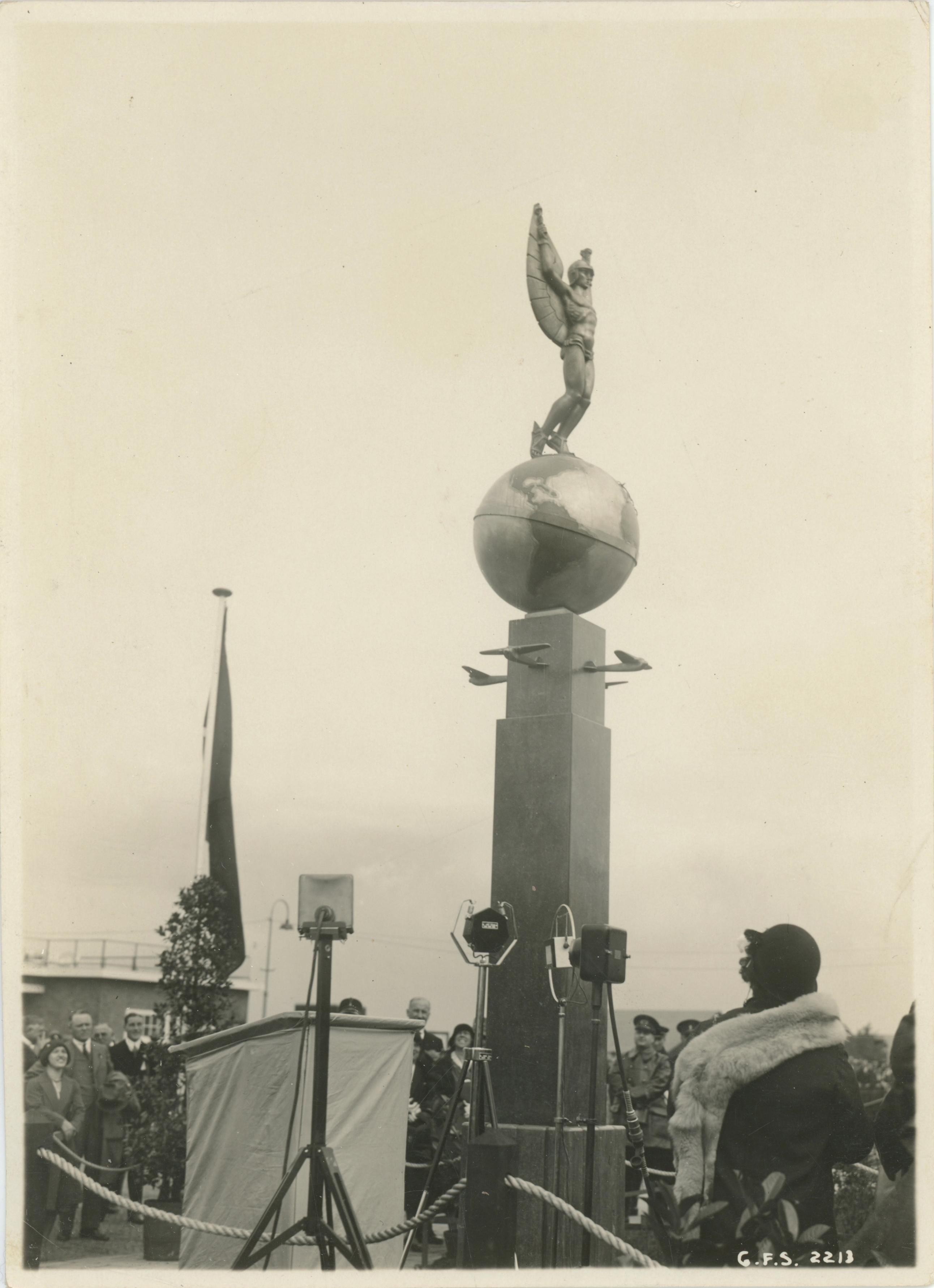 De tekst op de achterzijde van de foto: Onthulling monument geschonken door A. Fokker op Schiphol tijdens de vlootschouw.