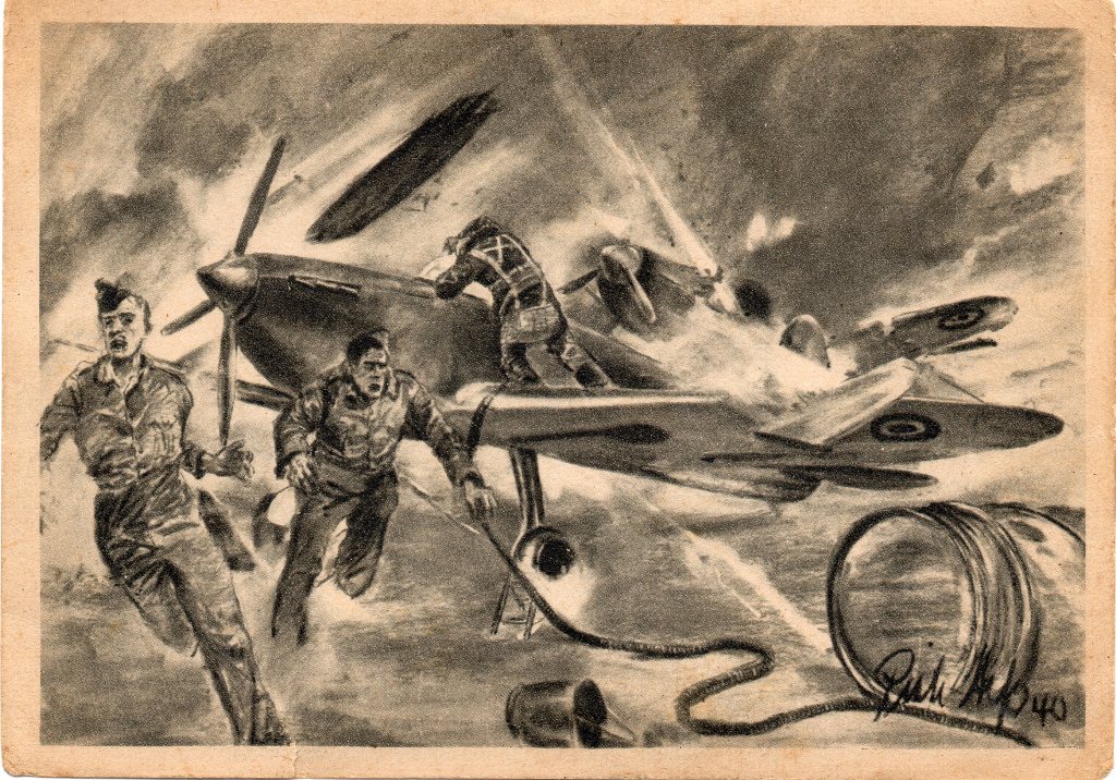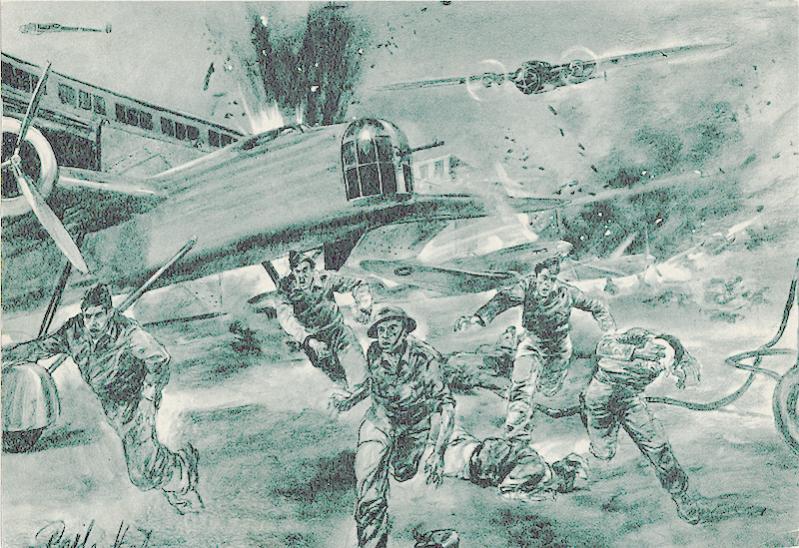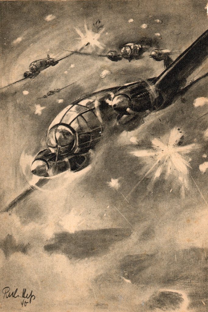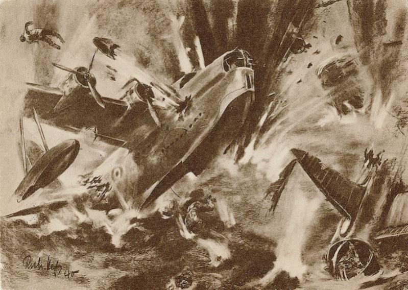 'Deutsche Kampflugzeuge überraschen eine englische Jagdstaffel beim Tanken' Zeignung R.Hess