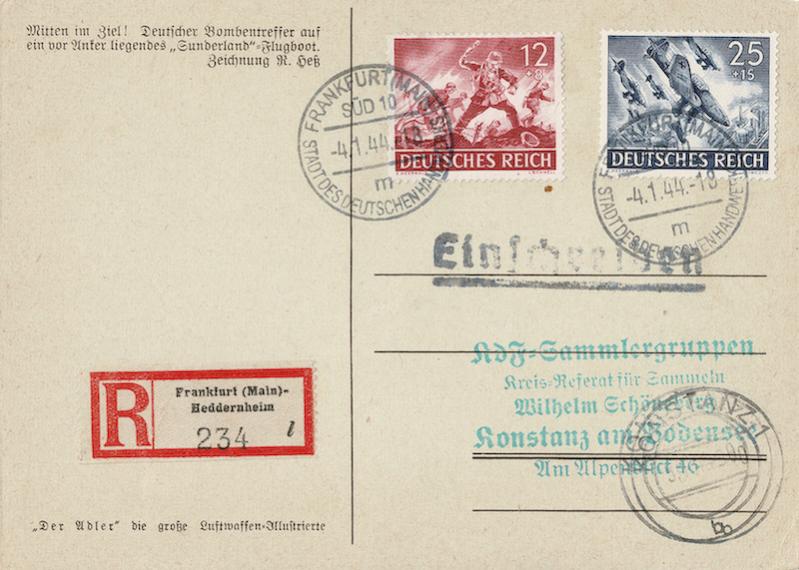 Kaart 495. "Mitten im Ziel! Deutscher Bombentreffer auf ein vor Anker liegendes 'Sunderland'-Flugboot". Een propaganda uitgave. Gestempeld 4 januari 1944.