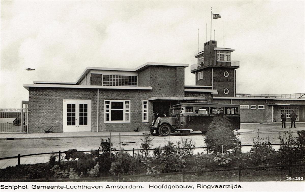 Hoofdgebouw Schiphol (Ringvaartzijde) en KLM bus.