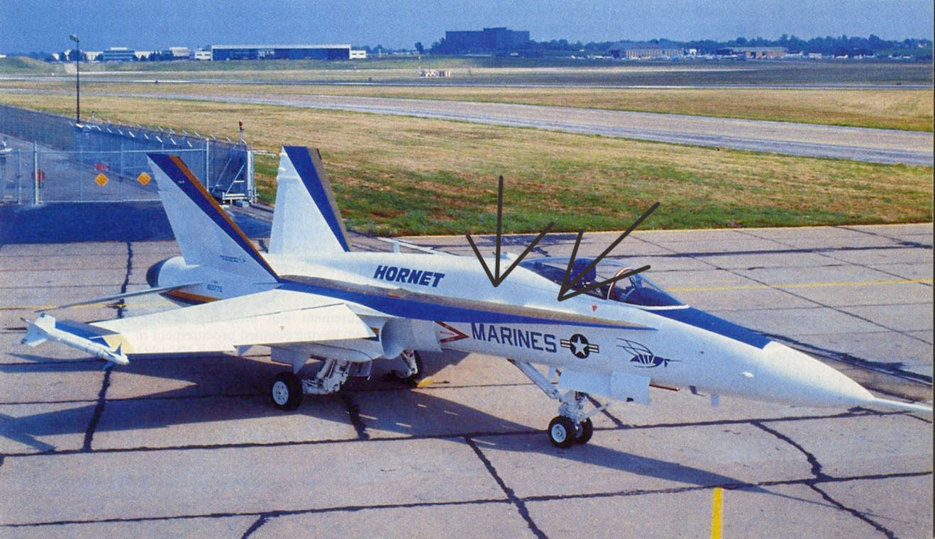 Hier een plaatje uit 1986, waar de Hornet nog geen 'fences' heeft en een foto uit 2006 waar 'het schot'duidelijk in het midden van de romp te zien is: