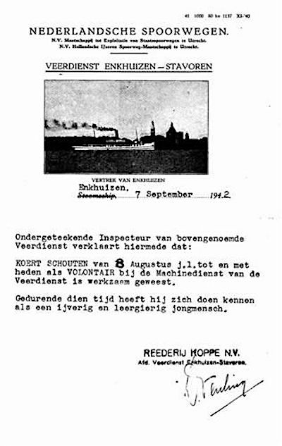 Er is een getuigschrift van zijn volontairschap op de veerdienst Enkhuizen–Stavoren van 8 augustus t/m 7 september 1942, hieronder geplaatst.