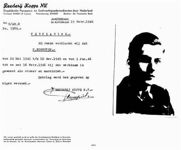 Rechts is in een ontslagbrief van Rederij Koppe te zien dat Koert in mei 1943 bij hen in dienst trad als stoker en machinist. Mogelijk dat hij tussen 7 september 1942 en 24 mei 1943 de machinistenschool heeft afgemaakt. Zeker weet ik dat natuurlijk niet.