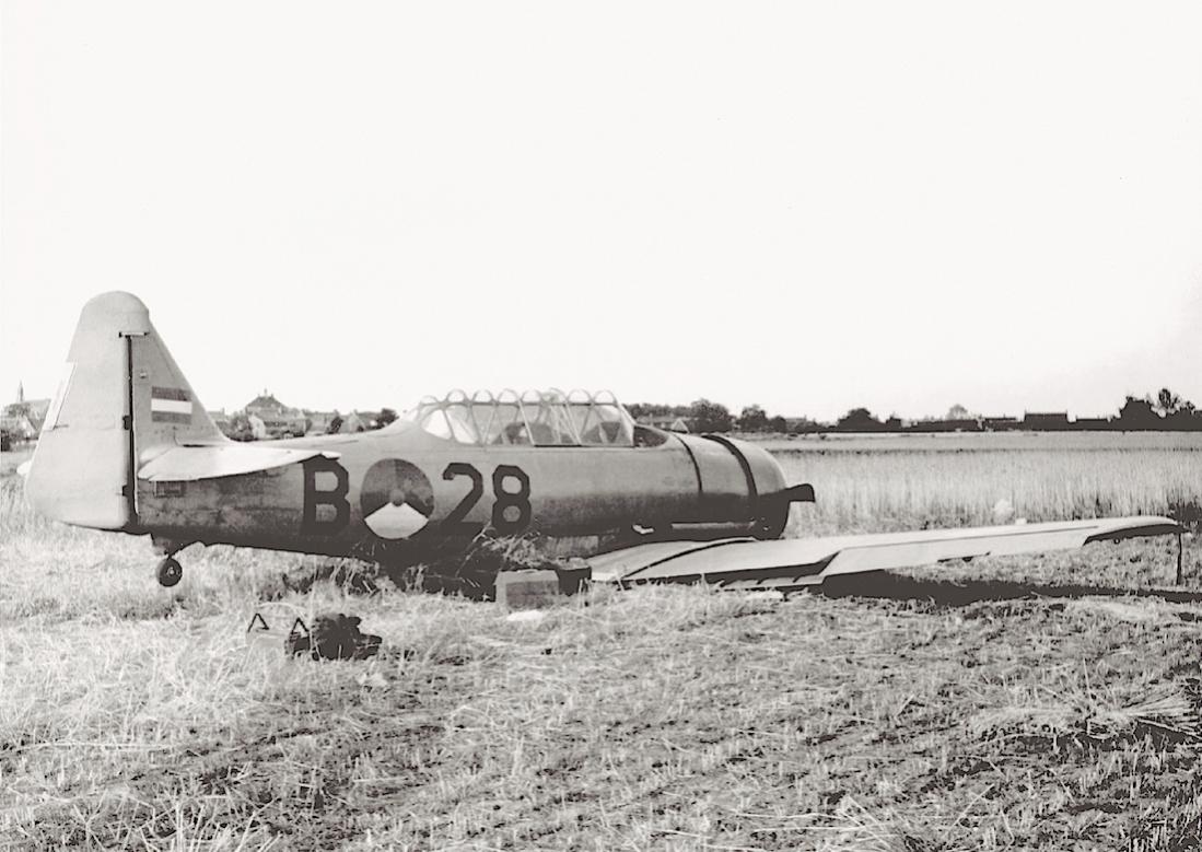 De B-28 heeft wel meerdere ongevalletjes gehad. Te weten op 1947/04/29, 1947/05/15, 1949/10/27, 1950/05/03, 1954/07/27 en 1958/07/18. Gezien het plaatje moet het hier om de buiklanding bij Made gaan op 27 juli 1954: "Noodlanding in roggeveld uitgevoerd na motorstoring, veroorzaakt door storing in brandstoftoevoer. Propeller en nacacap beschadigd." toen de B-28 1094:45 uren op de teller had. Vlieger was Jan Toorenaar, met de rang Adelborst 1.