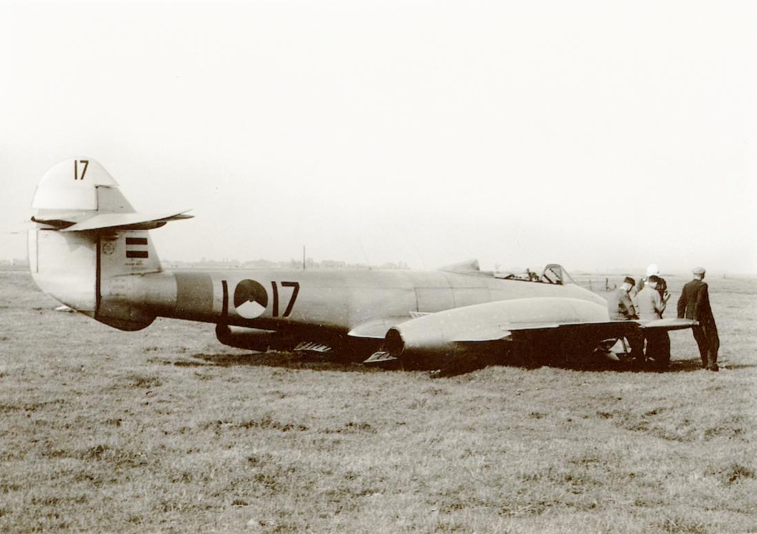 'I-17'. Gloster Meteor T.Mk.7 na noodlanding door gebrek aan brandstof op 11 juni 1953 bij Durgerdam. (Bron: Schoenmaker/Postma, "KLu vliegtuigen" blz. 100).
