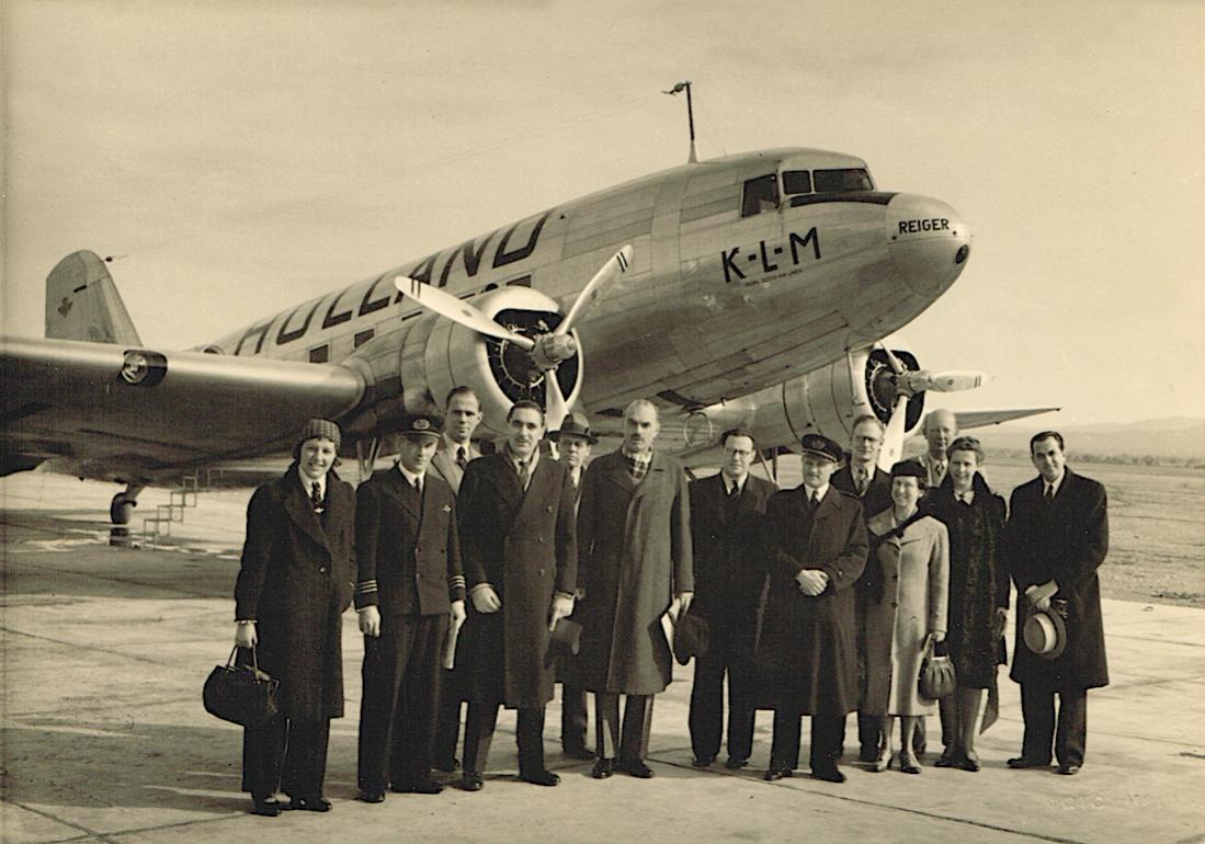 Griekse dignitarissen en KLM bemanning voor de DC-3 PH-ALR 'Reiger'.