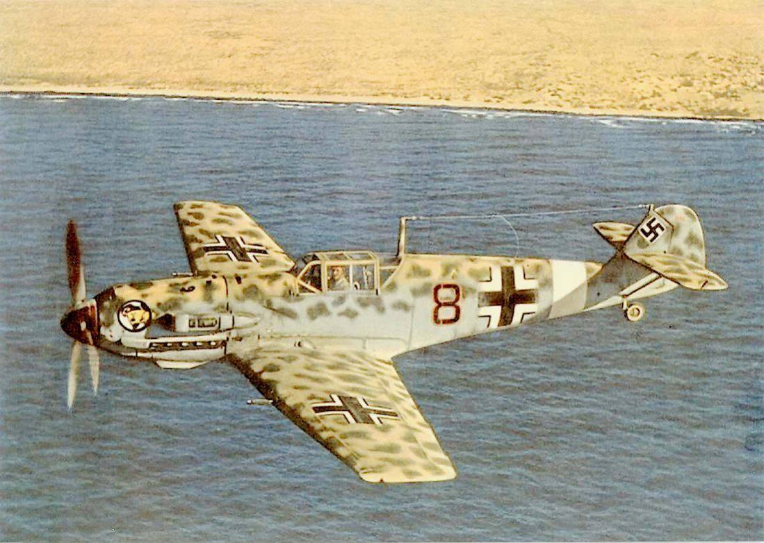 Oberleutnant Werner Schroer vliegt met zijn Messerschmitt Bf 109 E-7/U2 (trop) "Schwarze Acht" van I./JG 27 langs de Libische kust.