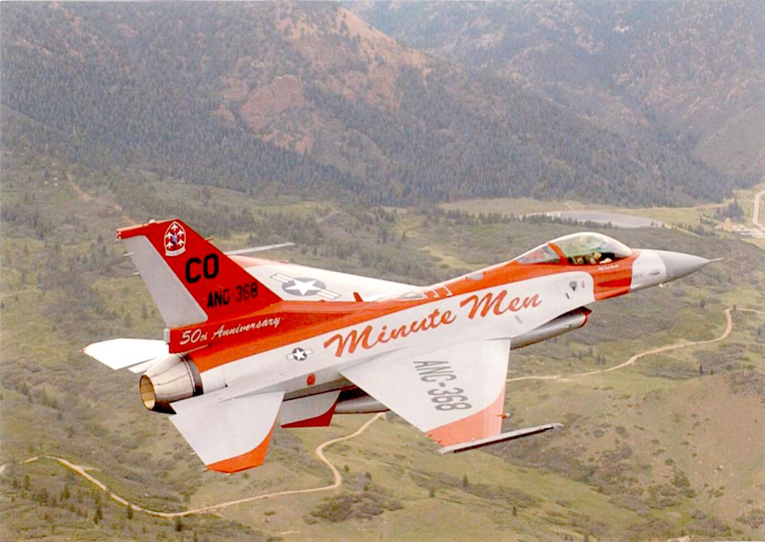 Fighting Falcon van de 140th Wing Colorado Air National Guard, de "Minute Men". Beschildering ter viering van het 50 jarig bestaan van het Minute Men demoteam.