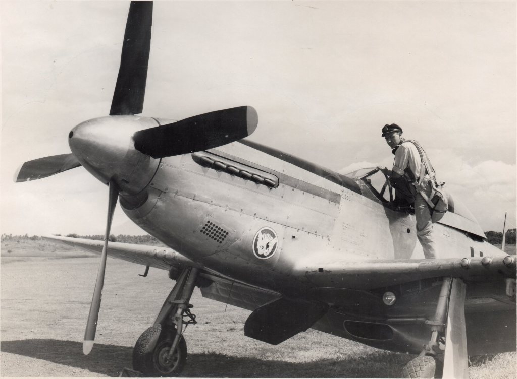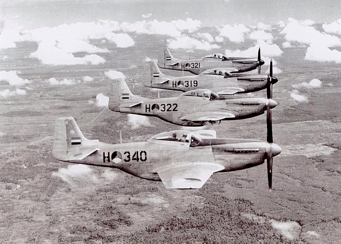 Op de achter kan stond geschreven: "Lt. Bill Jansen bestijgt zijn Pegasus, i.e. een van de Mustangs waarmede de M.L. tegenwoordig uitgerust is".