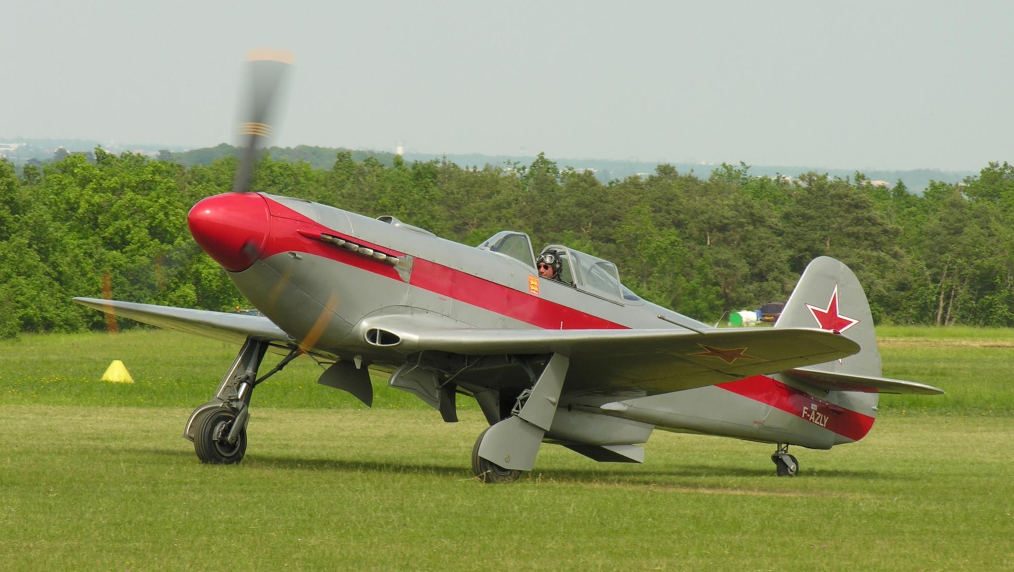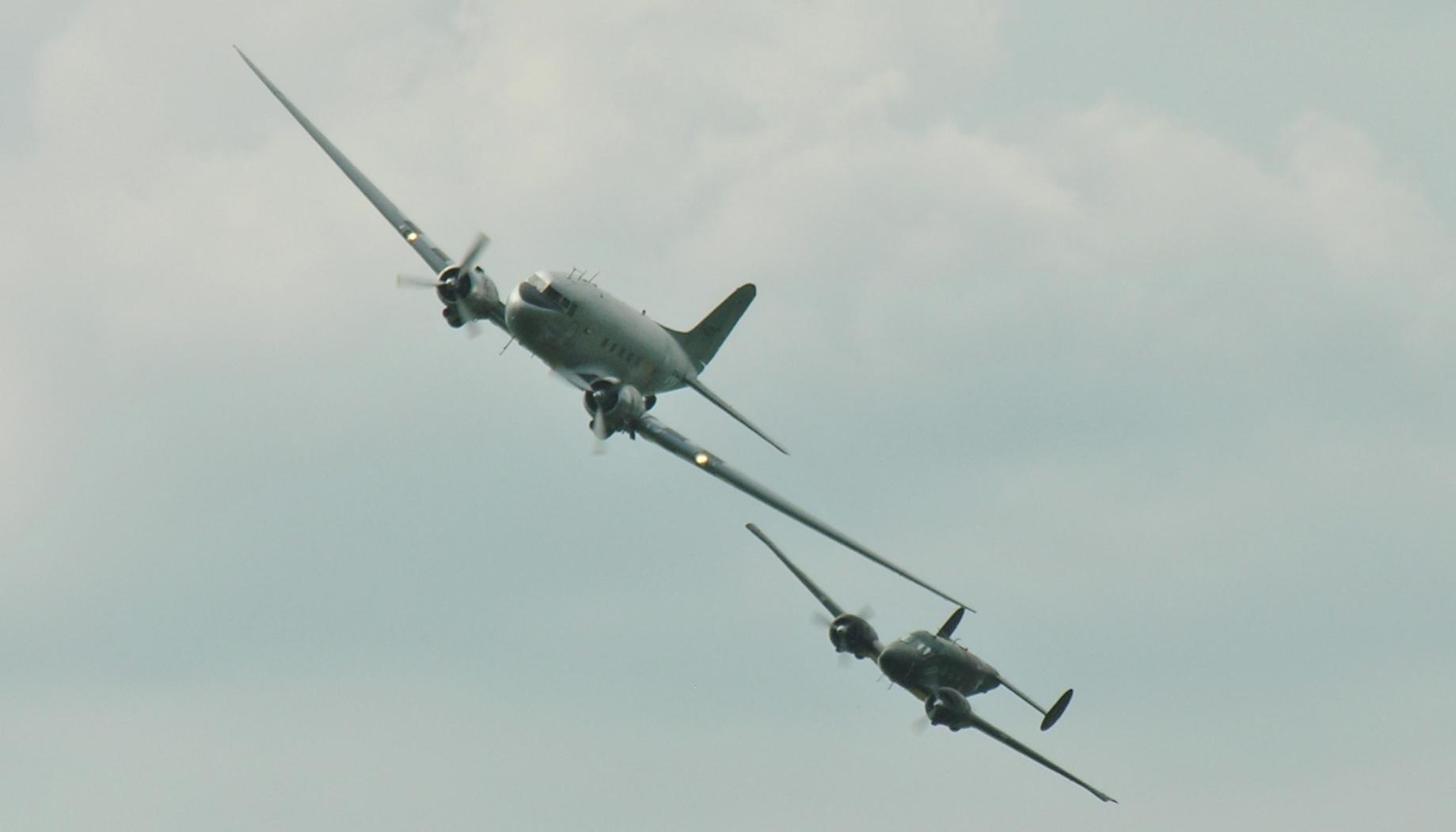 Het vlekje achter de staart is de 1e parachutist die sprong. Daarna de C-47 en de Beech 18. Dan een Yak-3, Een Klemm 35 en een Spitfire