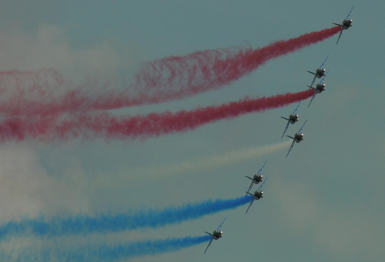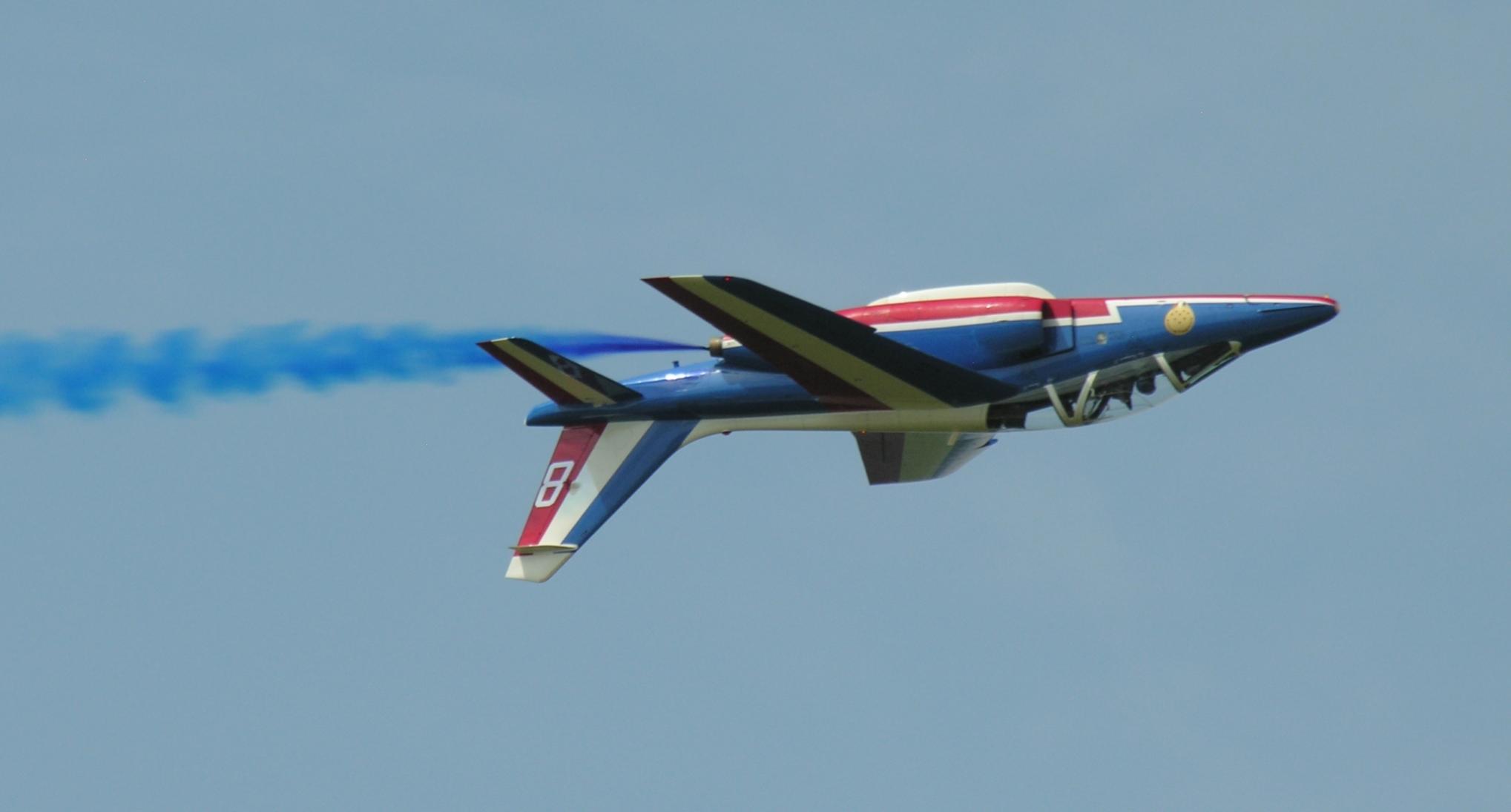 ik denk:Beech d-18 en patrouille de france op La Ferté. maar de beech ben ik niet zeker van, er lijkt een middelste staart vlak te zijn en dat heeft ie niet. de achtervleugel is niet afgerond, nogal vierkant dus het kan zijn dat dat de 2 verticale stabilo's zijn. weet u zelf het antwoord wel? :P