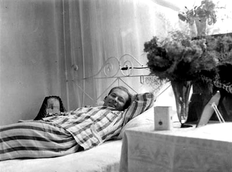 Gekleed in zijn Marine-verstrekking flanellen pyama met strepen, lekker, in de tropen en zonder airco, herstelde hij voorspoedig.