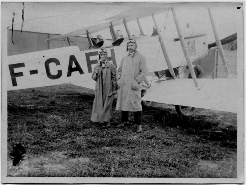 Deze heerlijke originele (waarschijnlijk unieke) fotootjes werden op 2 juli 1922 genomen op het vliegveld Le Bourget bij Parijs. Het stempel op de achterkant vermeldt: ‘Roger Beaudelot, 10bis Rue de Gaité, Paris XIVe’ . Waarschijnlijk is Roger de man die passagiers van de rondvluchten fotografeerde. De dappere mensen die zich in die tijd aan een vliegtocht(je) waagden, lieten dit gebeuren natuurlijk graag op de gevoelige plaat vastleggen. De 2 mensen op de bovenste foto zijn geen piloten, maar passagiers. De vliegkappen en stofbrillen zijn duidelijk geleend van de C.A.F. De jassen passen niet. De 2 foto’s zijn op dezelfde dag op Le Bourget gemaakt., maar niet op dezelfde plek, daarom vermoed ik dat de beide passagiers ook na de landing werden gefotografeerd.