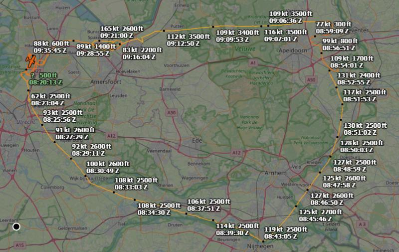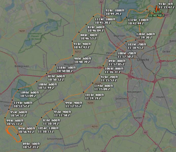Mooi om het resultaat te zien zoals bv. 10:50:00 met 118 kt op 500 ft en dan 10:50:52 met 81 kt op 600 ft. Honderd feet gestegen en 37 kt verlies in snelheid en dan om 10:51:44 met 108 kt op 600 ft. Afgevlakt en snelheid gewonnen. Ik denk dus dat je het toerental tijdens het stijgen niet hebt verhoogt of vergis ik me?